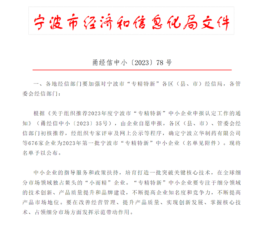 近日,宁波市经信局公布2023年第一批市级专精特新“小巨人”企业名称,海通食品(宁海)有限公司荣登榜单,序号560。